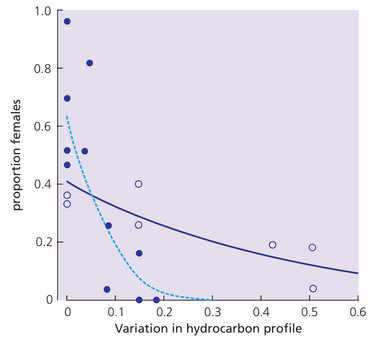 图13.12 木蚁F. truncorum的烃类化合物与性别比例。在多次交配蚁后的群体中,生殖后代雌性比例与工蚁角质层烃类特征变异度呈负相关。空心圆与实线为1994年采样群体,实心圆与虚线为2000年采样群体。曲线为逻辑回归线。引自Boomsma等(2003)。
