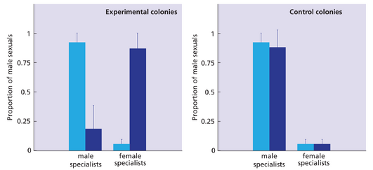 To summarize, the queen prefers an equal investment in male and female reproductive offspring, but the workers prefer a ratio biased 3:1 in favour of females. There is a direct conflict of interest over the sex ratio between workers and the queen. Who wins? And how?
