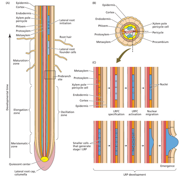 侧根原基的形成标志着侧根开始生长。细胞生长和几轮增殖(垂向、周向和切向)细胞分裂相结合,产生了一个圆顶状的原基,在侧根生长的最后阶段,原基作为侧根出现。新生原基上方的皮质和表皮组织会产生细胞壁软化酶,使其朝着根表和土壤的移动变得容易。一旦新的分生组织完全形成,它就获得了合成自身生长素的能力。因此,出现的侧根具有功能性的根尖分生组织(RAM),包括一个静止中心和周围的初始细胞,这些细胞会产生生长侧根的所有组织。