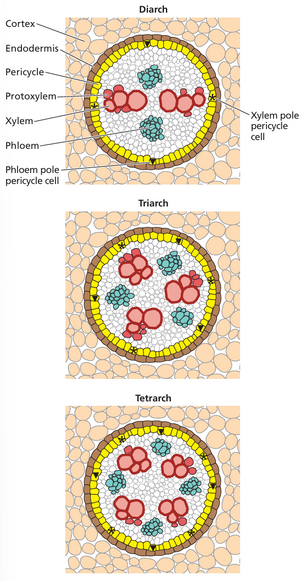 在包括拟南芥在内的大多数植物中,侧根仅在柱鞘中开始,柱鞘是位于内皮层内的组织(见第 1 章)。根部维管组织的排列方式可分为二元(拟南芥)、三元、四元等,具体取决于木质部臂(xylem arms)的数量,而木质部臂的数量与原生木质部束的数量相对应(图 19.8)。韧皮部极中柱鞘细胞phloem pole pericycle是位于韧皮部束附近的中柱鞘细胞,而木质部极中柱鞘细胞xylem pole pericycle则位于木质部臂的尖端附近。在拟南芥和大多数其他真双子叶植物和非禾本科单子叶植物中,侧根起始仅发生在木质部极中柱鞘细胞中,而在禾本科植物(例如玉米和大麦)中,侧根起始仅限于韧皮部极中柱鞘细胞这种差异提出了一个重要的问题:木质部极(大多数被子植物)或韧皮部极(某些单子叶植物)的中柱鞘细胞是如何与其他中柱鞘细胞区分开来的。由于该领域的大部分研究都是在拟南芥上进行的,因此我们将重点研究木质部极中柱鞘细胞发育成侧根的过程。