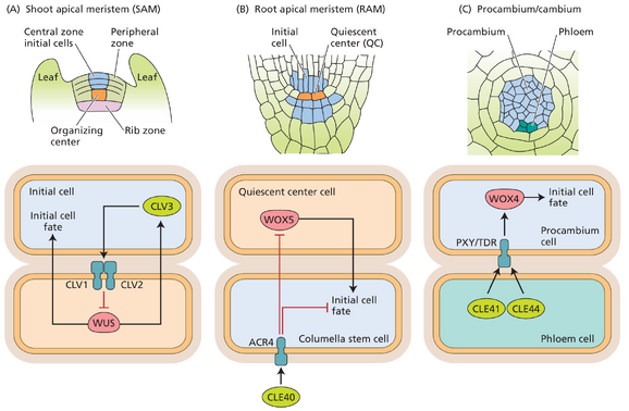 图 19.17 利用小肽和 WOX 类转录因子之间的调节相互作用的三种不同模式化过程的比较。(A) WUS 促进 SAM 中的顶端初始。 (B) WOX5 促进 RAM 中的初始。 (C) WOX4 促进维管形成层中的初始。