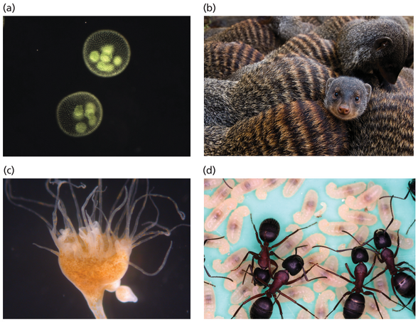 图12.1 合作行为。(a)团藻Volvox carteri weismannia的细胞通过合作形成球形多细胞群体,外围排列着多达8000个体细胞,中央则有少数更大的生殖细胞。这种体细胞与生殖细胞的区分类似于真社会性昆虫(eusocial insects)中工蚁与生殖蚁的分工。照片© Matthew Herron。(b)非洲缟獴(banded mongooses,Mungos mungo)在非洲东部、东南部和中南部的广大地区形成约7-50只的混性别合作群体。照片© Andrew Young。(c)感染共生藻(Symbiodinium microadriatum)的倒立水母(Cassiopea xamachana)。藻类(图中橙色部分)为水母提供光合产物以换取氮和无机养分。照片© Joel Sachs。(d)在社会性昆虫中(如木工蚁Camponotus hurculeans),某些个体会放弃独立繁殖机会,转而抚育其他个体的后代。照片© David Nash。