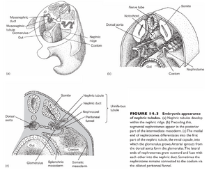 肾脏形成于位于胚胎背侧、后侧体壁的间介中胚层内。在其分化开始时,间介中胚层的后部会扩张,形成一个肾脊,略微突出于体腔背壁(图14.1a)。接下来出现的结构通常是成对的生肾节(Nephrotome[4](图14.1b)。生肾节通常是按体节排列的,包含肾腔(个人译名,nephrocoel),这是一个体腔,可能通过一个有纤毛的腹膜漏斗(个人译名,peritoneal funnel)通向体腔。接下来,生肾节的内侧末端增宽为一薄壁的肾小囊(renal capsule),肾小球(glomerulus[5],一簇动脉毛细血管arterial capillaries)长入其中。生肾节的外侧末端向外生长。该突起与来自连续肾节的类似突起融合形成共同的nephric duct (图14.1c),穿过间介中胚层向后到达泄殖腔。从胚胎发育的这一时刻开始,改变的生肾节更恰当地被称为泌尿小管(uriniferous tubule[6],现在其包含nephric duct,以及泌尿小管与肾腔的连接,肾腔可能通过持久的腹膜漏斗与体腔保持连接,也可能不保持连接(图14.1c)。