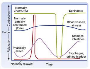 讨论平滑肌类型时要考虑的第二个因素是活动模式(图 14.1)。在某些器官中,平滑肌细胞有节奏地或间歇性收缩,而在其他器官中,平滑肌细胞则持续活跃并保持一定程度的“紧张度”。表现出有节奏或间歇性活动的平滑肌称为相位平滑肌phasic smooth muscle ,包括胃肠道 (GI) 和泌尿生殖道壁中的平滑肌。这种阶段性平滑肌对应于前面描述的单个单位类别,因为平滑肌细胞响应从一个细胞传播到另一个细胞的动作电位而收缩。另一方面,持续活动的平滑肌被称为强直性平滑肌tonic smooth muscle。血管平滑肌、呼吸平滑肌和一些括约肌持续活跃。紧张性平滑肌的持续部分激活与动作电位无关,尽管它与膜电位成比例。因此,紧张性平滑肌对应于前面描述的多单位平滑肌。平滑肌的相位和强直收缩是由肌动蛋白和肌球蛋白丝相互作用引起的,尽管如本章后面所述,在强直收缩期间,横桥循环动力学会发生变化,因此平滑肌可以以较低的能量成本维持力量。