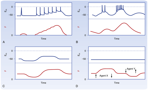 平滑肌的收缩活动可受多种因素控制,包括激素、自主神经、起搏器活动和各种药物。与横纹肌一样,平滑肌的收缩依赖于 Ca,而刚才列出的药物可诱导平滑肌收缩,是通过升高细胞内Ca浓度。然而,与横纹肌相比,平滑肌中的动作电位变化很大,并不总是启动收缩所必须的。此外,几种药物可以增加细胞内 [Ca],从而在不改变膜电位的情况下收缩平滑肌。图 14.5 显示了平滑肌中各种类型的动作电位及其相应的力量变化。平滑肌中的动作电位可能与缓慢的抽搐样反应有关,并且抽搐力可以在重复动作电位期间累加(即类似于骨骼肌中的强直)。这种活动模式是许多内脏中单个单位平滑肌的特征。