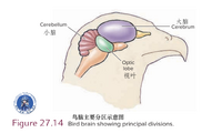 鸟类神经系统和感觉系统的设计,反映了飞行这一复杂问题以及高度视觉化生存方式的需求——它们必须觅食、交配、保卫领地、孵卵育幼,并正确区分敌友。鸟类的大脑具有发达的大脑半球、小脑和视叶(图27.14)。作为哺乳动物大脑主要协调中心的大脑皮层,在鸟类中较薄、无沟回且不发达(见图33.12)。取而代之的是,大脑半球的核心——背侧脑室脊——扩大成为主要的整合中心,控制着诸如进食、鸣叫、飞行和复杂的繁殖行为等活动。相对聪明的鸟类,如乌鸦和鹦鹉,其大脑半球比不那么聪明的鸟类(如鸡和鸽子)更大。鸟类的小脑比其他爬行动物大得多,它协调肌肉位置、平衡以及在运动和平衡中使用的视觉信息。视叶是中脑侧面隆起的结构,相当于哺乳动物的视觉皮层,负责组织视觉信息。