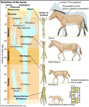 马的进化谱系是古生物学中记录最为详尽的之一。马科(Equidae)的历史始于始新世,该时期大约始于5600万年前,止于3390万年前。在始新世早期,出现了最早的马类祖先——一种蹄类食草哺乳动物,其学名为Hyracotherium,但通常被称为Eohippus,即“曙马”。在北美和欧洲均有发现的始马化石显示,这种动物身高为4.2至5手(1 hands=4英尺)(约42.7至50.8厘米,或16.8至20英寸),与现代马相比体型娇小,背部呈拱形,后躯高耸。四肢末端是带有肉垫的脚掌,前蹄各有四个功能性蹄,后蹄各有三个——这与现代马科动物无肉垫、单蹄的脚掌截然不同。其头骨没有现代马那种大而灵活的口鼻部,其颅骨的大小和形状表明其大脑远比今天的马的大脑小且结构简单。牙齿也与现代马科动物大不相同,适应了较为通用的食草动物饮食。事实上,始马(Eohippus)与现代马的差异如此之大,以至于最初人们并未察觉它与现代马科动物的进化关系。直到古生物学家发掘出后来灭绝的马类化石,始马与这些马类的联系才变得清晰。
