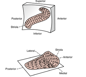 与壶腹嵴的毛细胞不同,耳石器官中的毛细胞并非全部朝向同一方向排列。