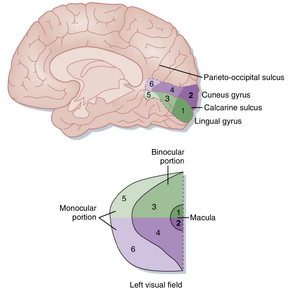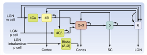 - 颞侧视网膜(temporal retina)的神经节细胞轴突向同侧脑部投射;鼻侧视网膜(nasal retina)的轴突则在视交叉(optic chiasm)处交叉。由于晶状体会反转落在视网膜上的图像,视野的每一侧都会被投射到双眼的对侧脑区。在丘脑的外侧膝状核(lateral geniculate nucleus, LGN)中,来自每只眼的输入终止于不同的层次,且M型神经节细胞(对运动敏感)和P型神经节细胞(对细节和颜色敏感)也分别投射到不同的层次。