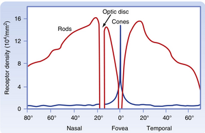 Fovea(中央凹)是Macula lutea中的凹陷区域,具有视网膜最高的视觉分辨率,如前所述,注视点的光线正聚焦于此(眼球运动的主要功能之一是将目标物带入中央凹视野)。中央凹区域的视网膜层结构特殊,其中若干层似乎被推挤至周围黄斑区。因此,光线无需穿过视网膜内层即可到达中央凹光感受器,从而最大程度减少图像畸变和光损失。中央凹的视锥细胞具有异常细长的外节(outer segment),可实现高密度排列。事实上,中央凹的视锥细胞密度达到最大值,从而提供高视觉分辨率和高质量成像(图8.4)。
