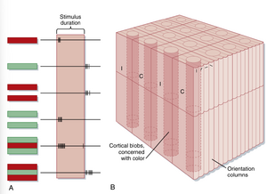 - LGN通过视辐射(visual radiation)投射至初级视皮层(纹状皮层,primary visual/striate cortex),主要终止于第4层,该层存在有序的视网膜拓扑图谱(retinotopic map)。在此图谱中,来自每只眼的信息映射到交替相邻的点位上,形成在皮层垂直延伸的眼优势柱(ocular dominance columns)。第4层外的纹状皮层神经元对特定朝向的条状或边缘刺激反应最佳。偏好特定刺激朝向的细胞群聚形成朝向柱(orientation columns)。