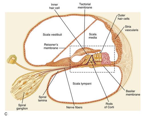 与前庭相延续的是前庭阶(scala vestibuli),这个螺旋形腔室延伸至耳蜗顶端,在此处通过蜗孔(helicotrema)与鼓室阶(scala tympani)相连并融合。鼓室阶是另一个螺旋形空间,沿耳蜗向下回旋并终止于圆窗(round window)(见图8.17B)。除蜗孔外,分隔这两个腔室的是膜迷路包裹的中阶(scala media)。