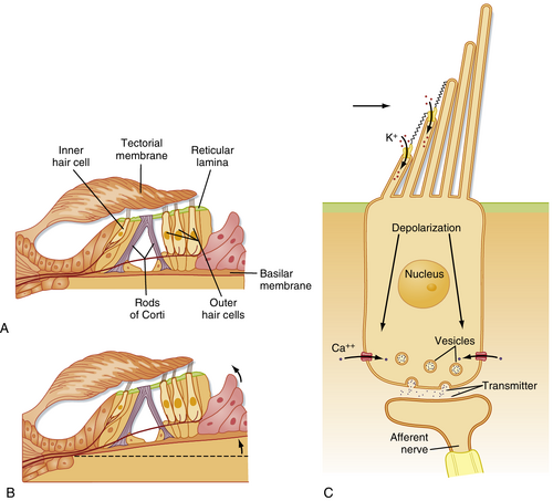 [[文件:BL-8.18.png|缩略图|• 图8.18 静息状态下的柯蒂氏器(organ of Corti)细节(A)和基底膜(basilar membrane)上移时的状态(B)。基底膜上移由于毛细胞和盖膜(tectorial membrane)的相对位移产生的剪切力使静纤毛弯曲。C,显示剪切力如何打开机械感受器K+通道并使毛细胞去极化的毛细胞示意图,图中标明了纤毛间尖端连接的分布。|居中|500x500像素]] | |||