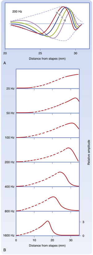 [[文件:BL-8.19.png|缩略图|• 图8.19 不同频率的声音在柯蒂氏器不同部位引起不同幅度的位移。A,基底膜由200\ H z声音产生的行波。a、b、c、d处的曲线表示基底膜在不同时间的位移,虚线是由不同时间波峰形成的包络线。最大偏移发生在距离卵圆窗约29\mathrm{mm} | |||