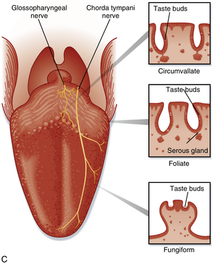 味蕾分布于舌、腭、咽和喉部的不同味觉乳头上。味觉乳头类型包括:位于舌前部的菌状乳头(fungiform papillae)、舌侧部的叶状乳头(foliate papillae),以及舌基部的轮廓乳头(circumvallate papillae)(见图 8.29C)。轮廓乳头可能包含数百个味蕾。人类舌部可拥有数千个味蕾。由于响应各类味质的味蕾广泛分布,舌部不同区域对不同味质的敏感度仅存在微小差异。味蕾的神经支配来自三对脑神经:面神经(CN VII)的鼓索支支配舌前2/3的味蕾,舌咽神经(CN IX)支配舌后1/3的味蕾(见图 8.29C),迷走神经(CN X)支配喉部和上食道的少量味蕾。