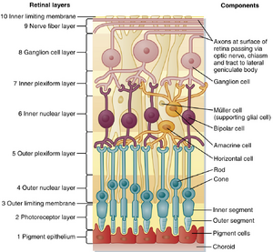 - 光感受器细胞的外段负责光信号转导。光感受器与视网膜双极细胞形成突触连接,后者继而与其他中间神经元及神经节细胞形成突触。神经节细胞通过视神经将信号传递至脑。视神经离开视网膜形成的视盘不含光感受器,故形成盲点。视网膜空间分辨率最高的区域是中央凹及其周围的黄斑区。