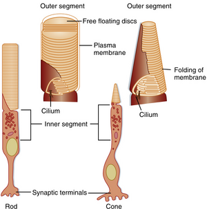 光感受器的外节通过特化的纤毛与内节相连,内节含有多种细胞器(包括大量线粒体)。内节是视色素被合成并整合入外节膜结构的位点。在视杆细胞中,色素被插入新形成的膜盘,随后这些膜盘向远端移位,最终在外节顶端脱落并被色素上皮细胞吞噬。该过程决定了视杆细胞外节的杆状形态。在视锥细胞中,视色素随机插入外节的膜折叠结构中,且不存在类似视杆细胞的膜盘脱落现象。