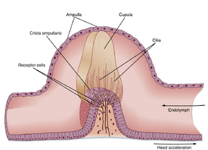 [[文件:BL-8.24.png|缩略图|• 图8.24 壶腹内壶腹嵴(crista ampullaris)示意图。每个毛细胞的静纤毛与动纤毛均延伸入顶帽(cupula),后者横跨整个壶腹腔。头部向右运动(加速)将导致内淋巴向左流动,顶帽随之向左偏转。]] | [[文件:BL-8.24.png|缩略图|• 图8.24 壶腹内壶腹嵴(crista ampullaris)示意图。每个毛细胞的静纤毛与动纤毛均延伸入顶帽(cupula),后者横跨整个壶腹腔。头部向右运动(加速)将导致内淋巴向左流动,顶帽随之向左偏转。]] | ||