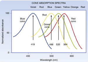 相比之下,视锥细胞对光的敏感度较低,因此最佳工作环境为日间光照条件(明视觉)。视锥细胞负责高视锐度和色觉功能。