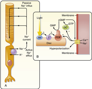 当光被视杆细胞吸收时(视锥细胞中会发生等效的序列过程),视紫红质(rhodopsin)的光异构化会激活一种称为转导蛋白(transducin)的G蛋白(见图8.6B)。该G蛋白进而激活与含视紫红质的盘膜结合的环鸟苷酸(cyclic guanosine monophosphate, cGMP)磷酸二酯酶(phosphodiesterase),将cGMP水解为5^{\prime}-GMP,并降低视杆细胞质中的cGMP浓度。cGMP的减少导致cGMP门控阳离子通道关闭、视杆细胞膜超极化以及神经递质释放减少。因此,cGMP作为"第二信使",将视紫红质吸收光子的过程转化为膜电位的变化。