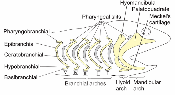 [[文件:脊比7-66.png|居中|缩略图|图7.66咽颅的系统发育。请注意鳃弓是如何重塑的,以在每个后续组中发挥各种功能。鳃篮的各个部分变成颌骨、气管软骨、舌支撑、脑颅组成部分和耳听小骨。罗马数字表示鳃弓数。]]