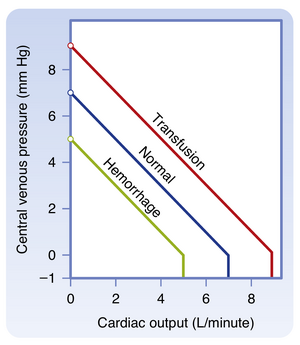 [[文件:BL-19.4.png|缩略图|  • 图19.4 血容量增加(输血曲线)和血容量减少(失血曲线)对血管功能曲线的影响。血管功能曲线的类似偏移可分别通过静脉张力的增强和减弱产生。]]