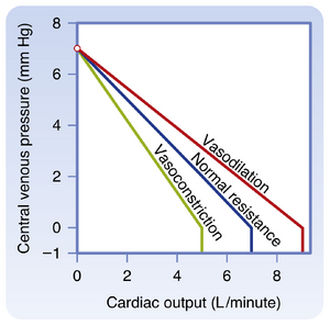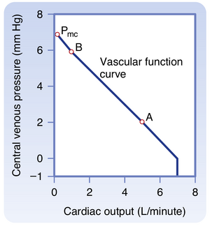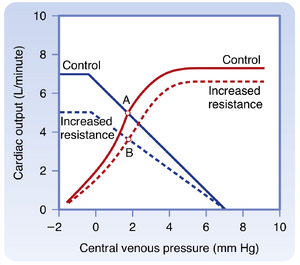 [[文件:BL-19.3.png|缩略图|  • 图19.3  心输出量变化引起的中心静脉压变化。平均循环压(或静态压)(Pmc)是心输出量为0时整个心血管系统达到的平衡压。点B和A分别代表心输出量为1 L/min和5 L/min时的静脉压值。  ]]
