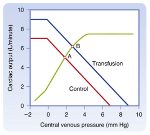 [[文件:BL-19.9.png|缩略图|  • 图19.9  输血后,血管功能曲线右移。因此,随着平衡点从点A转移至点B,心输出量和静脉压均增加。  ]]
