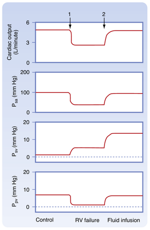 [[文件:BL-19.13.png|缩略图|  • 图19.13  图19.12所示循环模型中,模拟右心室(RV)衰竭和模拟液体输注引发的心输出量、体循环动脉压(Psa)、体循环静脉压(Psv)及肺静脉压(Ppv)的变化。箭头1处,右心室泵血功能停止(模拟RV衰竭),右心室仅作为低阻力通道;箭头2处,系统内液体容量增加,此时右心室仍仅作为通道。(修改自Furey SA, et al. Am Heart J. 1984;107:404)  ]]