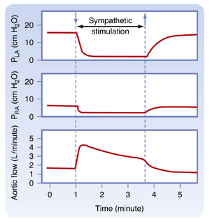 [[文件:BL-19.8.png|缩略图|• 图19.8  电刺激心脏交感神经纤维时,主动脉血流量(心输出量)增加,而左心房压力(PL A)和右心房压力(PR A)降低。这些数据与图19.7得出的结论一致,其中观察到心输出量和静脉压的平衡值在心脏交感神经刺激期间从点A转移至点D(即心输出量增加,但中心静脉压下降)。(改编自Sarnoff SJ 等,Circ Res. 1960;8:1108)  ]]