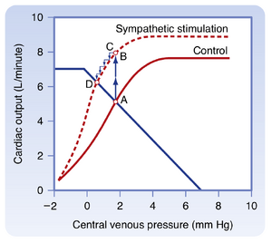 [[文件:BL-19.7.png|缩略图|  图19.7 心肌收缩力的增强(例如通过心脏交感神经刺激)会使心输出量与中心静脉压(Pv)的平衡值从控制状态下的血管功能曲线和心脏功能曲线(实线)交点(点A)移至同一血管功能曲线与交感神经刺激后的心脏功能曲线(虚线)交点(点D)。  ]]