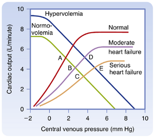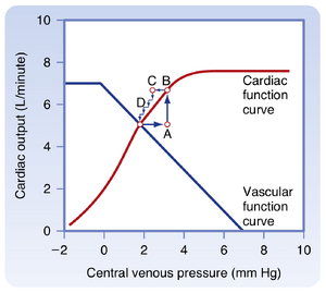 [[文件:BL-19.10.png|缩略图|  • 图19.10 中度或重度心力衰竭使心脏功能曲线向右下方移位。在血容量改变前,心输出量减少而中心静脉压升高(从对照平衡点A移至点B或点C)。在心力衰竭中通常发生的血容量增加后,血管功能曲线右移。因此,中心静脉压可能升高但心输出量未减少(点D),或在严重心力衰竭时伴随心输出量降低(点E)。]]