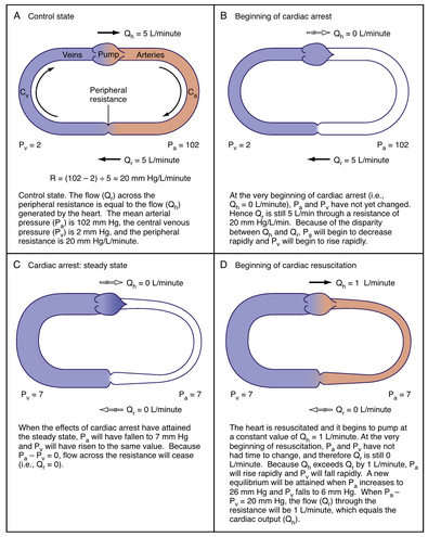 随着心脏停搏持续,血液流经阻力血管导致动脉血容量逐渐减少,静脉血容量以相同绝对速率逐渐增加。由于动脉和静脉是弹性结构,动脉压逐渐下降,静脉压逐渐升高。这一过程持续进行直至动静脉压力达到平衡(见图19.2C)。当满足此条件时,通过阻力血管从动脉流向静脉的血流速率(Q)为0 L/min,此时Qh亦为0 L/min。