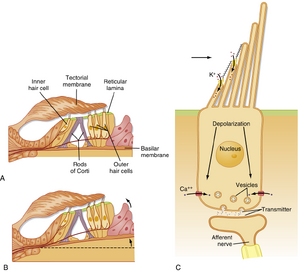 [[文件:BL-8.18.png|缩略图|• 图8.18 静息状态下的柯蒂氏器(organ of Corti)细节(A)和基底膜(basilar membrane)上移时的状态(B)。基底膜上移由于毛细胞和盖膜(tectorial membrane)的相对位移产生的剪切力使静纤毛弯曲。C,显示剪切力如何打开机械感受器K+通道并使毛细胞去极化的毛细胞示意图,图中标明了纤毛间尖端连接的分布。]] | |||
