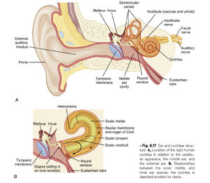 - 耳廓(pinna)和外耳道(auditory canal)将空气传导的声波传递至鼓膜(tympanic membrane)。中耳的三块听小骨(ossicles)将鼓膜的振动传递至充满液体内耳(inner ear)的卵圆窗(oval window)。由于外耳道的尺寸和听小骨的力学特性,人类听觉在约3000 Hz频率处最为敏感。