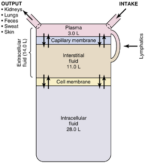 由于女性通常比男性有更高的体脂比例,她们的总体水平均约占体重的50%。在早产儿和新生儿中,总体水占体重的70%至75%。因此,在讨论平均体液隔室时,我们应该意识到存在因年龄、性别和体脂比例而异的差异。 | 由于女性通常比男性有更高的体脂比例,她们的总体水平均约占体重的50%。在早产儿和新生儿中,总体水占体重的70%至75%。因此,在讨论平均体液隔室时,我们应该意识到存在因年龄、性别和体脂比例而异的差异。 | ||