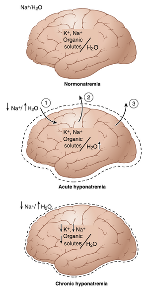 [[文件:GT-25.7.png|缩略图|图25-7. 低钠血症(hyponatremia)期间的脑细胞体积调节。在急性低钠血症期间,由于N a+的丢失或 H2 O的过量,H2O会扩散进入细胞(1),导致脑组织肿胀(由虚线表示)。这一过程刺激了N a+、K+和有机溶质从细胞中运出(2),随后导致水从细胞中扩散出来(3)。在慢性低钠血症中,通过溶质从细胞中运出,脑肿胀得以减轻。]] | |||