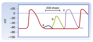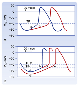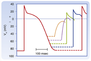 任何可兴奋细胞的特征都表现为能够对刺激产生动作电位。然而,要实现这一过程,刺激必须使膜去极化达到阈值电位,其绝对值因细胞类型和时机而异。在心肌组织中,能够启动并传导动作电位的阈值取决于:(1)所涉及的是快反应还是慢反应动作电位;(2)刺激到达时处于心动周期的具体时间点。