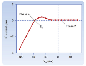 尽管在去极化膜电位时K+的驱动力显著,但在平台期大部分时间内gK(钾电导)仍然很低。这是因为在4期开放的IK1通道在0期时失活,而在1期激活的大部分Ito通道已进入失活状态。这解释了心室动作电位2期时膜电位为何维持在ECa(钙平衡电位)和Ek(钾平衡电位)之间。gK的降低减少了维持去极化所需流入细胞的Ca++量,同时也减少了平台期可能外流的K+量。这两种效应都降低了通过主动转运机制维持这些离子梯度所需的能量。