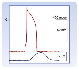 快反应动作电位存在于构成心脏收缩细胞主体的心房肌细胞和心室肌细胞中。此类动作电位也存在于构成浦肯野纤维的肌细胞中,这些纤维是负责将电冲动快速传导至心室心肌各区域的特殊传导系统的组成部分。快反应动作电位可分为五个时期:上升支(upstroke,0期)、初期复极(1期)、平台期(2期)、终末复极(3期)和静息膜电位(4期)。这些动作电位具有其他几个关键特征:第一,正如其名所示,在升支阶段(0期)表现出膜电位的快速变化,这有利于冲动在细胞间的快速传导。这些动作电位还具有显著的平台期(2期),赋予其特征性的长的持续时间(200-400 ms)。另一个重要的特性是在心脏舒张期(4期,即心脏处于松弛或静息状态时),膜电位保持较高负值(约-90 mV)。心室肌细胞快反应动作电位与收缩的关系如图16.2所示。快速去极化(0期)先于细胞缩短发生,复极完成恰好在缩短达峰之前。肌肉松弛主要发生在动作电位的4期。收缩持续时间通常与动作电位持续时间平行。