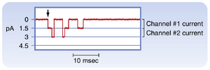 通过膜片钳技术可以测量单个膜通道传导的离子电流。通道的开放和关闭往往以看似随机的方式反复进行。图16.5展示了这一过程,图中显示了心肌细胞中流经Na+通道的电流。在此实验中,膜电位最初被"钳制"在静息状态下的-85mV。箭头指示时间点时,电位突然被改变为-45mV以激活这些通道,并在记录剩余时间内保持该电位。膜去极化后立即有一个通道开放(幅度1.5pA),随后第二个通道开放(两个通道总电流3 pA)。这些通道随后多次开放和关闭,最终进入失活状态并保持关闭。