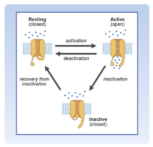 在快速反应细胞中,兴奋性取决于可用的电压依赖性Na+通道生成动作电位升支的能力。一旦快速反应动作电位被引发,去极化的细胞在至少部分复极化之前不能被再次兴奋。这是因为在动作电位升支后立即失活的Na+通道必须从失活状态恢复后才能重新开放。这是一个具有时间和电压依赖性的过程,发生在更负的膜电位水平。