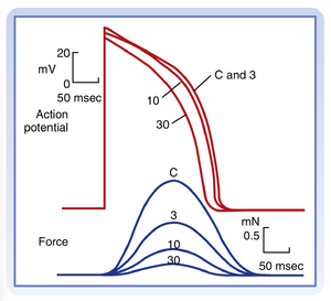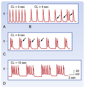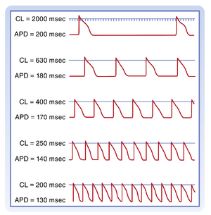 心肌细胞的兴奋性也可能受到周期长度(即连续动作电位之间的时间间隔)变化的影响。这是由于周期长度对动作电位时程的作用所致。因此,起搏频率或心率的变化通常是某些心律失常(arrhythmias,即不规则心律)发生或终止的重要因素。图16.14显示了浦肯野纤维在周期长度从2000毫秒逐步缩短至200毫秒时引起的动作电位时程变化。值得注意的是,随着周期长度缩短,动作电位时程相应缩短。这种动作电位时程与周期长度之间的正相关关系可通过涉及延迟整流钾离子通道的钾电导变化来解释。这些通道在动作电位平台期通常激活非常缓慢,复极后去激活或关闭的速度也同样缓慢。随着周期长度逐渐缩短,动作电位之间的间隔时间也减少,导致这些通道没有足够时间关闭。因此,保持激活状态的通道会逐渐累积。其结果是在平台期钾电导增加,从而导致更早的复极和更短的动作电位时程。