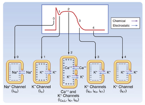 然而在动作电位上升支(phase 0)期间,这种情况发生逆转:膜对Na+的电导增加,而对K+的电导降低。结果导致膜电位发生去极化,逐渐偏离EK并趋近于Na+的平衡电位(ENa)。基于这一基本原理,只要明确细胞膜上存在的离子通道类型及其门控(gating)的机制(即控制通道开放与关闭的因素),就能完整解释动作电位的离子基础。