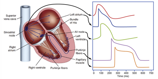 (细胞内的)电阻值决定了刺激电流从刺激点传播的距离。细胞内电阻越低,电流传播的距离越远,动作电位=的传导速度也越快。因此,直径较大且形态较简单的细胞(如浦肯野纤维中的细胞)能够更快传导冲动,而较小的细胞(如房室结(AV node)中的细胞)则倾向于以较慢速度传导冲动。
