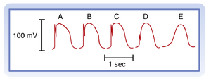 - 在某些异常情况下,正常动作电位可能触发后除极(afterdepolarization)。早期后除极(EADs)发生于正常动作电位的3期,当起始心搏的基本周期长度较长且心脏动作电位异常延长时更易发生。延迟后除极(DADs)出现在4期,当细胞内Ca++超载时更易发生。