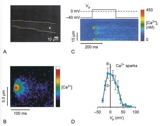 - 兴奋时,电压门控钙通道开放使细胞外Ca++进入心肌细胞的二联管间隙(dyadic space)。Ca++内流激活肌质网(sarcoplasmic reticulum)释放Ca++(即"Ca++火花")。多个Ca++火花总和形成胞浆[Ca++]的总变化,引发肌丝收缩。此过程构成"心脏E-C耦联的局部调控理论(local control theory of cardiac E-C coupling)"。