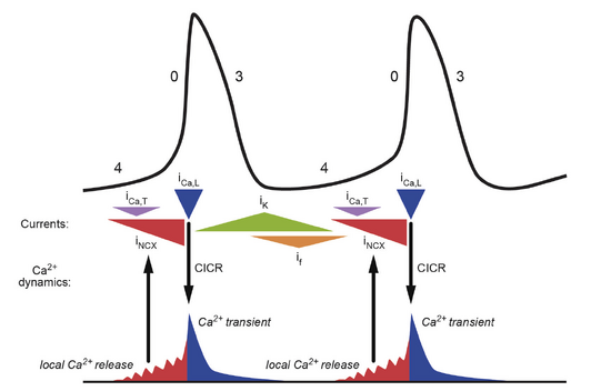 每次心跳的启动是心脏自身固有的特性。心脏内特定细胞类型具有自动节律性(automaticity),即在舒张期自发去极化并启动传导冲动的能力。这种行为最常见于构成SA结的细胞中产生的慢反应动作电位,如前所述。然而,在主要功能通常与传导冲动相关的细胞中(如AV结中产生慢反应动作电位的细胞,以及浦肯野网络中产生快反应动作电位的细胞)也能观察到该现象。