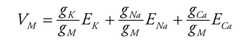 该关系式表明:任一离子对膜电位(membrane potential)的贡献程度由两个因素决定:一是该离子在膜电导中的相对占比(即该离子电导gion与总膜电导gM的比值),二是该离子的平衡电位。简言之,VM本质上是膜通透各离子平衡电位的加权平均值,其中各离子的权重系数即为其在总膜电导中所占比例。由此得出的核心结论是:VM会向膜电导占比最大的那个离子的平衡电位方向移动。