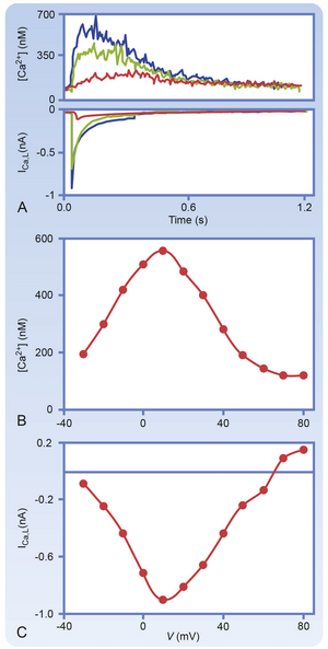 慢反应动作电位的升支由L型Ca++通道(CaV1.2)的活性引起(Fig. 16.9)。这些通道激活导致的gCa增加使膜电位去极化,并向ECa趋近。与快反应动作电位中Na+通道参与的情况不同,窦房结细胞动作电位升支期间的膜电位变化速率要慢得多。这是因为L型Ca++通道的激活速度远慢于Na+通道,且通道密度更低。